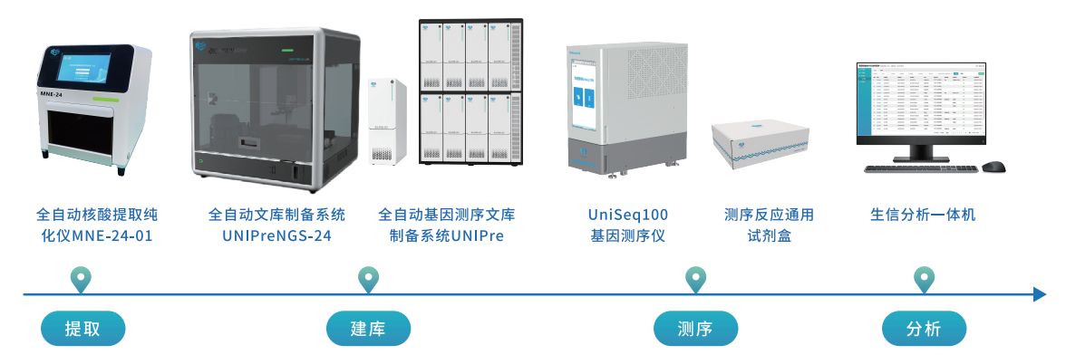 基于UniSeq100的NGS实验全流程,铭毅智造推出整套本地化、封闭式、自动化的NGS解决方案LENA系统(Local Enclosed NGS Automation System),其涵盖了从提取、建库、测序,到检测报告等全流程所需的铭毅自主研发的自动化设备和试剂耗材。